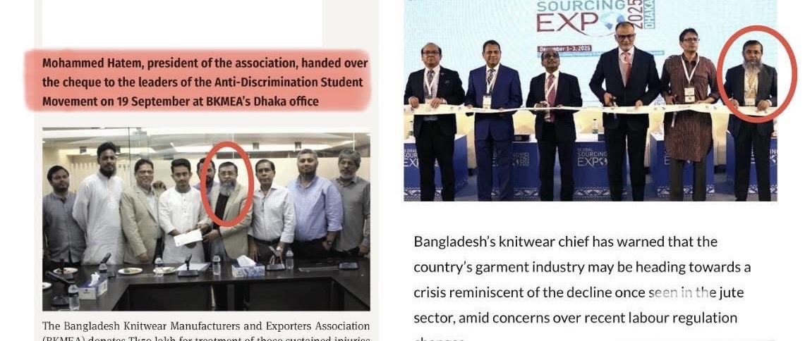 অন্যদিকে, বাংলাদেশ জামায়াতে ইসলামী–এর ইফতার অনুষ্ঠানে বিকেএমইএ সভাপতি মোহাম্মদ হাতেম–এর উপস্থিতি নিয়ে সমালোচনা করে তাকে ‘ফ্যাসিস্টের দোসর’ বলা হয়েছে বলেও উল্লেখ করেন তিনি। অথচ একই ব্যক্তিকে অন্য প্রেক্ষাপটে গ্রহণযোগ্য হিসেবে দেখা গেছে—এমন দ্বৈত অবস্থান নিয়েই প্রশ্ন তোলেন সাংবাদিক।