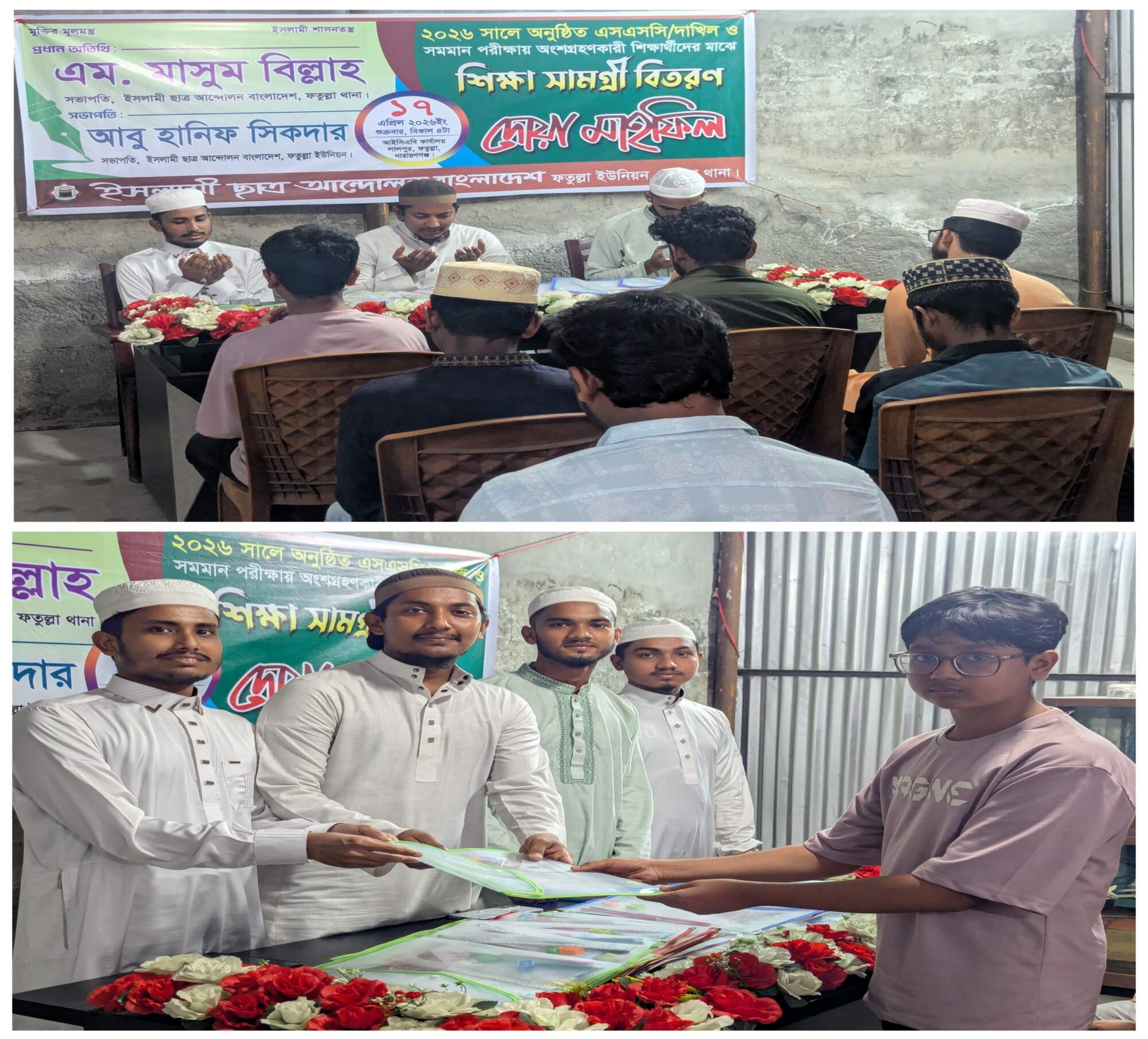 ফতুল্লায় এসএসসি ও দাখিল পরীক্ষার্থীদের সফলতা কামনায় দোয়া ও শিক্ষা সামগ্রী বিতরণ করেছে ইসলামী ছাত্র আন্দোলন।